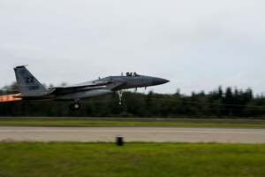 U.S. Air Force Col. Matthew Powell, 354th Maintenance Group commander, accepts the 354th MXG guidon from Col. Benjamin Bishop, 354th Fighter Wing commander, during a change of command ceremony at Eielson Air Force Base, Alaska, July 26, 2019. Powell was previously the commander of the 3rd MXG at