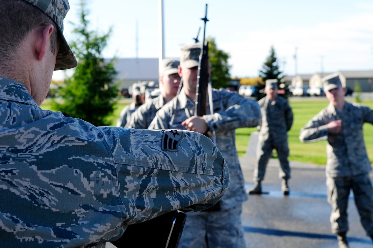 Staff Sgt. Joel Peace oversees an Honor Guard practice here Sept. 13. Honor Guard members practice Honor Guard routines several times before executing them at an event always striving for precision and perfection. Peace is assigned to the 354th Medical Operations squadron as a dental technician and is also an Honor Guard flight sergeant. (U.S. Air Force photo by/Airman 1st Class Yash Rojas)
