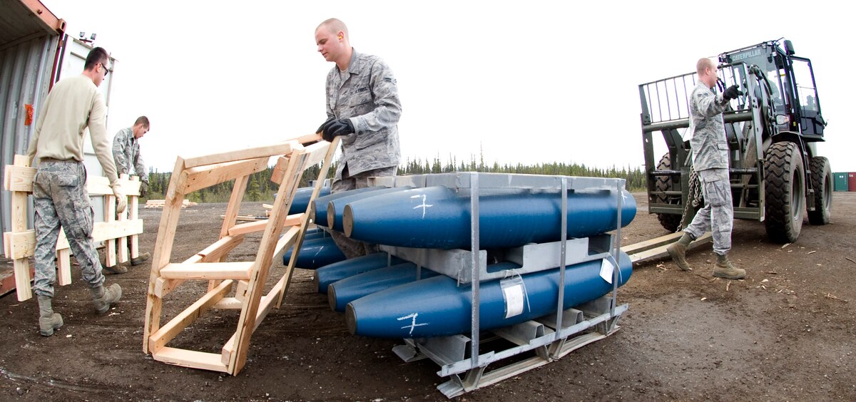 EIELSON AIR FORCE BASE, Alaska -- Airman 1st Class Blake Weeden removes a packing crate from inert munitions during the spring barge arrival at Eielson May 20, 2011. The 354th Maintenance Squadron munitions flight Airmen prepare the bombs for use by joint and coalition forces to train with during RED FLAG-Alaska, Distant Frontier and Northern Edge exercises. (U.S. Air Force photo/Airman 1st Class Laura Goodgame)