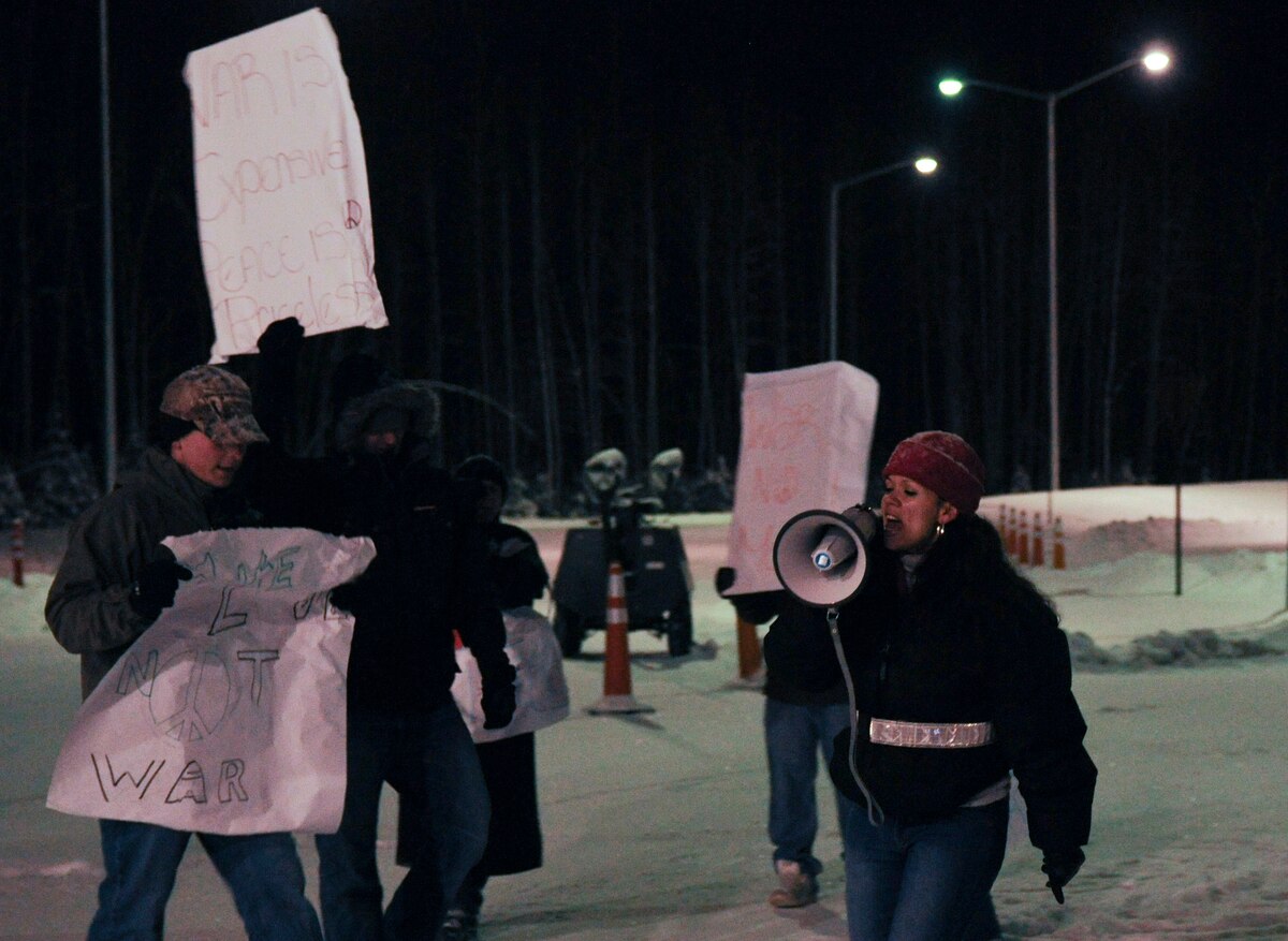 Capt. Ryan Bodge, right, arrives on scene to deliver a proclamation from the 354th Fighter Wing commander about the protest, while Master Sgt. Carroll Stone, left, explains the current situation of the Airmen simulating as protesters outside the installation during a 354th Fighter Wing and 168th Air Refueling Wing combined Operational Readiness Exercise Nov. 3, 2008, at Eielson Air Force Base, Alaska. The exercise trains Airmen how to handle different situations that during a mass deployment to support operations in the Pacific Region. Both Airmen are assigned to the 354th Security Forces Squadron. (U.S. Air Force photo/Senior Airman Jonathan Snyder)