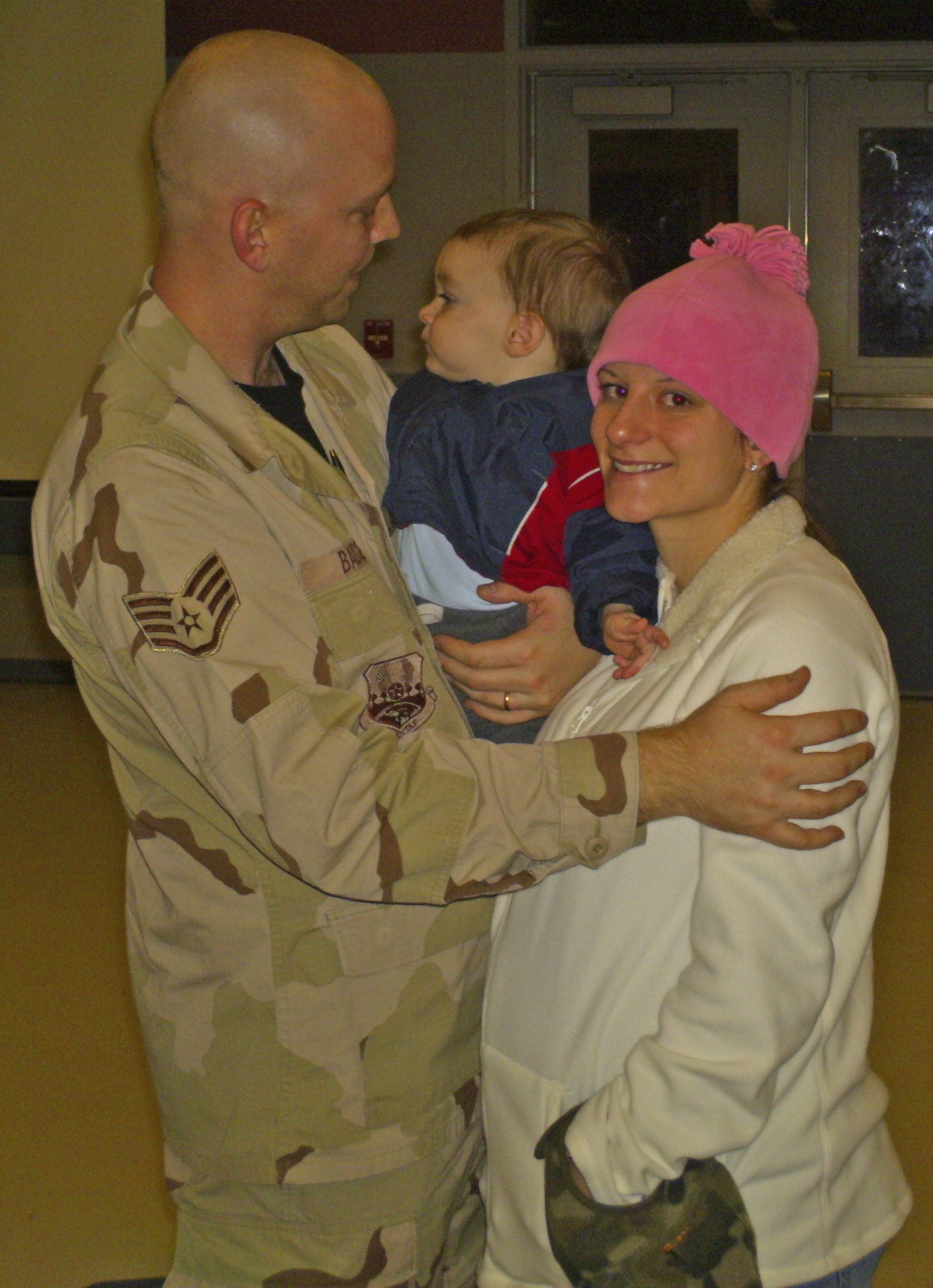 EIELSON AIR FORCE BASE, Alaska --After withstanding more than 36 hours on a chartered flight, Staff Sgt. Thomas Badgero 354th, Logistics Readiness Squadron, is greeted by wife Rose and son Hunter Jan. 23 at the Joint Mobility Complex. (U.S. Air Force photo by Senior Airman Aaron Bonifazi)