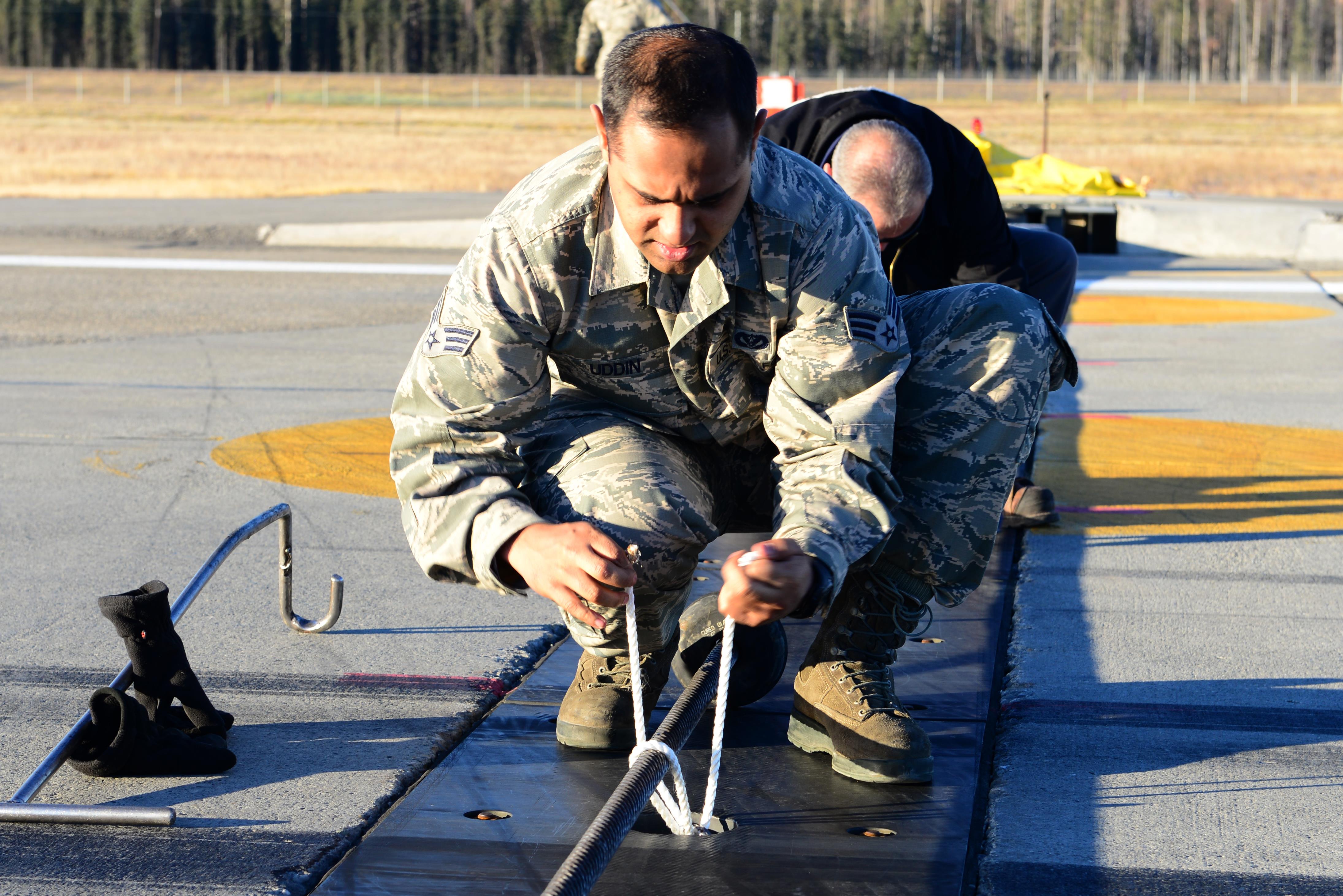 U.S. Air Force Senior Airman Arbab Uddin, a 354th Civil Engineer Squadron power production technician, ties down a barrier Oct. 12, 2016, at Eielson Air Force Base, Alaska. RED FLAG-Alaska 17-1 is in its third day and flying operations would slow if Uddin and the rest of the power production Airmen weren’t efficient in their job. (U.S. Air Force photo by Airman 1st Class Cassandra Whitman)