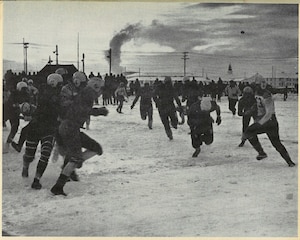 The first Ice Bowl was played on January 1, 1949 between the Ladd Field Flyers and the University of Alaska Polar Bears. The annual contest drew up to 2,500 local spectators and garnered interest far beyond the local Fairbanks community. Billed as “the farthest North football game ever,” the event